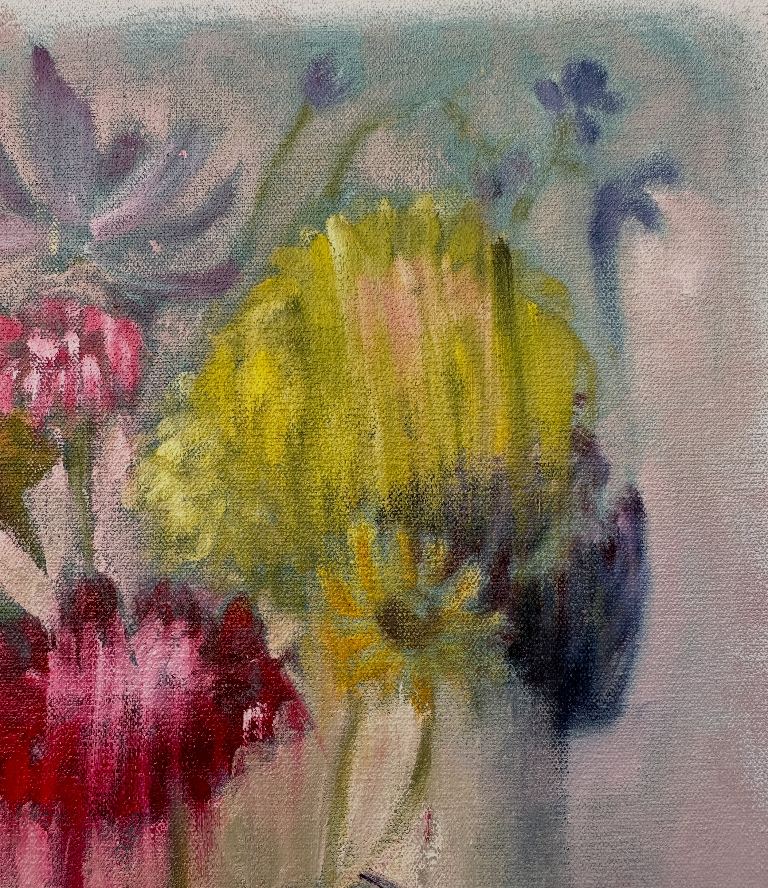 Blue Vase began as a simple still life—a vase arranged on a table to be studied and painted. But as the days passed, the flowers wilted and shifted, and I found myself painting from memory rather than observation. The image became softer, blurred, and filled with the feeling of what once was.
